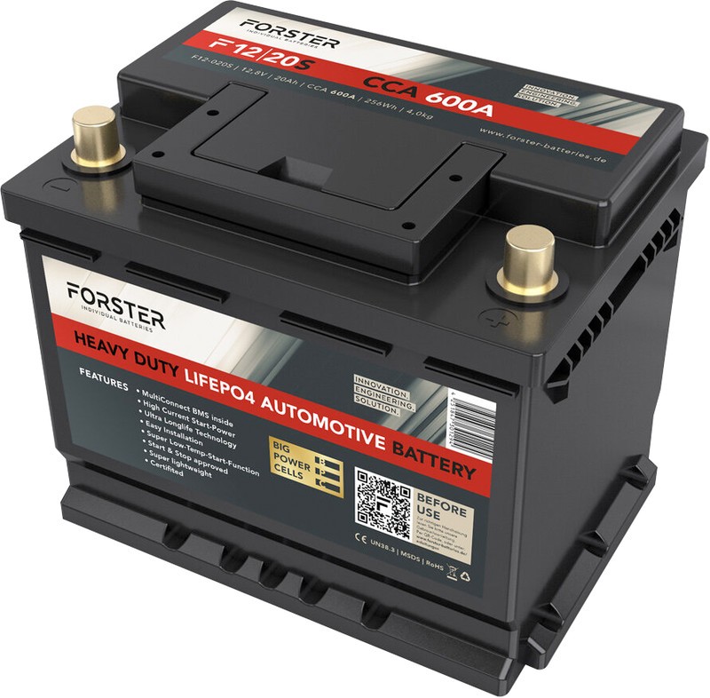 Nombre Bateria litio FORSTER PREMIUM STARTER 20Ah Detalles Bateria de litio para arranque. Descripción Bateria de litio para uso de arranque del motor, tambien uso para sistema Start & Stop y pequeña aplicaciones de tracción Bateria controlada por la App gratuito del fabricante desde el telefono movil. Código F12-020S Fabricante No Voltaje (V) 12V Capacidad (Ah) 20Ah Salida (A) 600A Largo (mm) 242 Ancho (mm) 175 Alto (mm) 190 Posicion bornes + derecha Tecnología litio LiFePO4 Peso (Kg) 4.0000 Garantía (años) 2