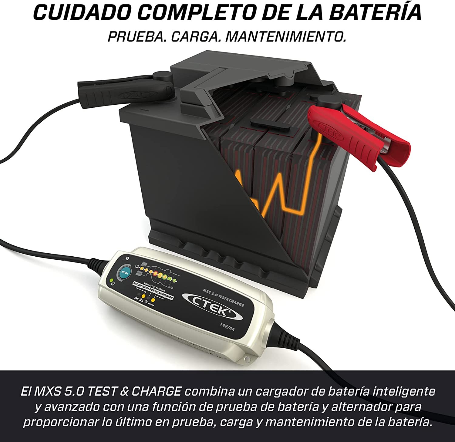 Nombre CTEK MXS 5.0 TEST & CHARGE | Para baterias de motos y coches e incorpora comprobador de baterias y alternador. Detalles Cargador para todo tipo de baterías de ácido plomo + test de baterías. Descripción Descripción Comprueba la tensión, la alimentación de arranque y el rendimiento del alternador MXS 5.0 TEST & CHARGE es adecuado para baterías desde 1,2 Ah hasta 110 Ah, ( AGM, GEL, SLA, Convencinal, etc. menos para baterias de litio que seria el CTEK CT5 Power Sport. La función de pruebas tiene tres programas fáciles de usar para probar la tensión de batería, la energía de arranque y el rendimiento del alternador. Proporcionan una imagen completa del estado de la batería y del sistema de carga del vehículo. MXS 5.0 TEST & CHARGE tiene además un programa patentado de desulfatación automática, un modo especial para regeneración de baterías muy descargadas y el sistema flotante/pulsante patentado de CTEK, el modo de mantenimiento más avanzado para baterías conectadas por largo tiempo. Características Carga baterías desde 1,2 Ah hasta 110 A Fase de mantenimiento patentada flotante/pulsante Display LED de fácil lectura Protegido contra salpicaduras y polvo (IP65) Operación segura sin chispas Protegido contra polaridad inversa Protegido contra cortocircuitos Código 56-308 Fabricante No Salida (A) 5A Voltaje (V) 12V Tecnología Baterias acido-plomo como: AGM, GEL, SLA, CLASICAS, Etc Largo (mm) 100 Peso (Kg) 1.0000