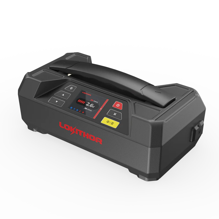 Nombre Lokithor JTC4250 PRO | 4250A, 3 en 1 Cargador, arrancador y tester de baterias.¡¡ NOVEDAD !! Detalles Especificaciones Modelo JTC4250 Polaridad de la abrazadera Rojo (+), Negro (-) Arrancador de salto Voltaje nominal 12.8V Capacidad 89.6Wh (LiFePO4) Tensión inicial 12V Corriente Máxima 4250A Temperatura de carga 0°C a 45°C (32°F a 113°F) Temperatura de almacenamiento -20°C a 50°C (-4°F a 122°F) Temperatura de operación -20°C a 60°C (-4°F a 140°F) Vida de servicio >2000 ciclos (en buen estado) Cargador de batería Entrada AC 100-240V~50/60HZ 2A Max Salida de carga 6V (6A), 12V~15V (6A), Max 90W Químicas de la batería El plomo-ácido y LiFePO4 Tipos de batería 6V, 12V Capacidad de la batería Hasta 120Ah Temperatura de funcionamiento -10°C a 45°C (14°F a 113°F) Detección de baja tensión 1V Clasificación IP IP65 (con puertos cerrados) Probador de batería de 12V Tipo de batería Batería de plomo de 12V Prueba de Cranking Apoyado Prueba de carga Apoyado Prueba de batería Apoyado Conexión Bluetooth Apoyado Impresora incorporada N/A Otros USB - Una salida 5V / 3A, 9V / 2A, 12V / 1.5A USB - Entrada y salida C 5-20V / 3A (PD 60W) Salida BX80 (en modo de alimentación) 5-20V 0-6A, 90W Max (potencia de CA) 5-20V 0-5A, 60W Max (potencia de la batería) Lumen led 300 lúmenes Dimensiones (L x W x H) 264*146.2*109.5mm (10.39*5.76*4.31inch) Peso neto 7.4kg Certificación FCC CE ROHS UN38.3 UKCA RCM SAA AS/NZ5 62368 Capacidad de la batería del vehículo soportado Hasta 120Ah Descripción Jump Starter Con 4250A: Ofrece una corriente máxima de 4250 amperios, capaz de arrancar vehículos con motores diesel de gasolina de hasta 10L y 8L. Banco de energía: actúa como una fuente de alimentación portátil de 89.6Wh con puertos de carga / descarga bidireccionales TYPE C y un puerto de salida de CC, que alimenta múltiples dispositivos. Soluciones de carga inteligente: Este versátil cargador admite baterías de plomo-ácido de 6V y 12V y baterías de litio de 12V con carga de CA de 6A. Cuenta con múltiples modos de carga, incluida la carga normal, la carga forzada y el modo de mantenimiento, lo que garantiza que sus baterías estén siempre en condiciones óptimas. Con la tecnología de carga de 5 etapas, mantiene la batería durante la noche o más, mientras que el voltímetro integrado ayuda a identificar el estado de la batería. Diagnóstico de batería integral: El probador de baterías JTC4250 ofrece diagnósticos en profundidad para baterías de 12V, incluidas evaluaciones de salud de la batería, pruebas de arranque y pruebas de carga. Cuenta con una aplicación conveniente para facilitar la visualización y exportación de datos de prueba, asegurando que tenga toda la información que necesita a su alcance. Tecnología ConnectMax: El sistema de última generación detecta automáticamente la impedancia de la conexión de la abrazadera a la batería de su automóvil, asegurando un contacto óptimo en todo momento y maximizando la eficiencia inicial de su arrancador de salto. LiFePO4 Rendimiento seguro: garantiza más de 2000 ciclos, superando significativamente las baterías de plomo-ácido y reduciendo los costos. Código LOKITHOR JTC4250 Fabricante No Salida (A) 4250A Voltaje (V) 12V Tecnología LITIO LiFePO4 Largo (mm) 180 Peso (Kg) 4.0000